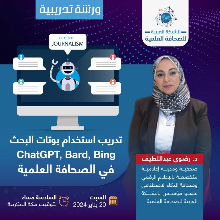 أقامت الشبكة العربية للصحافة العلمية يوم السبت 20 جانفي 2024 ورشة تدريبية حول استخدام بوتات البحث ChatGPT , Bard , Bing , في الصحافة العلمية.مع الدكتورة رضوى عبداللطيف ،صحفية ومدربة إعلامية متخصصة بالإعلام الرقمي وصحافة الذكاء الاصطناعي، وعضو مؤسس بالشبكة العربية للصحافة العلمية.